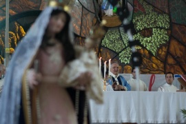 Alégrate, llena de gracia! sentencia el evangelio de la fiesta; y las miradas, aplausos y pañuelos fueron dóciles a esa alegría, mientras la imagen de María del Rosario hacía su entrada al templo con destino a ser testigo del Amor entregado y recibido. “El Señor está contigo, no temas!” pronunciaba el Ángel  y en concordancia con este mandato, hombres de fe compartieron el pastoreo y la tarea  que vienen realizando sobre el derecho a la vida como sagrado e inviolable; el acompañamiento a las familias y la Pastoral de la Juventud que dejó la vida y la fe, a los pies de María. “He aquí la esclava del Señor, que se haga en mí”…Sobre esta disponibilidad de  María, Monseñor Marcelo Colombo trajo a la memoria el Sí valiente y decidido de la iglesia frágil y temerosa de los primeros tiempos. “La iglesia de Mendoza dice sí a la vida, vale toda vida desde el seno materno hasta la muerte natural”, anuncia el pastor, agregando que se pone en juego la dignidad de la vida humana. La familia, en especial, las familias pobres y sin oportunidades, también aquellas que esperan ser integradas como prioriza la carta pastoral de los obispos de Mendoza; sumado a los flagelos como la vida por nacer y el descarte social que se hace de los ancianos; fueron conceptos firmes de la homilía de Monseñor. El relato del Anuncio, continúa diciendo que “Él será grande y su Reino no tendrá fin”…contundencia que se vio reflejada en el decir del arzobispo al hablar de poner “nuestro aporte”, del amor fuerte y fiel que impulsa mar adentro para acompañar la fragilidad humana; momento en que agradeció a los sacerdotes a la vez que les solicitó premura frente a las situaciones difíciles de la familia; como respuesta a la invitación de Francisco. “Recorrer juntos la cercanía misericordiosa del Buen Pastor…Sí a los jóvenes; Kairós como tiempo que viene para la plenitud de la vida. Necesitamos descubrir las razones de nuestra esperanza y transmitirla a los jóvenes que tienen sed de esperanza…” expresó el arzobispo de Mendoza,  invitando a la juventud a transformar un mundo viejo y enfermo en un mundo nuevo, es decir, haciendo lío, como expresara el Papa, en Río de Janeiro. Subrayó a la par el diálogo intergeneracional entre jóvenes y ancianos, Jóvenes que están invitados a ser testigos en tiempos complejos, sumado a los desafíos de la realidad social, del cuidado de la tierra, el aire y el agua. La iglesia y la sociedad esperan que Ella cuide nuestro corazón y temple nuestras voces. Es el momento del Banquete Eucarístico y se hace verdad el “Sean Uno” como envío de Jesús, en donde todos son invitados y conmovidos ante el Pan entregado y repartido. Hacia el cierre de la celebración y en un ritual profundo, un nuevo rosario, construido por las dominicas contemplativas del monasterio Nuestra Señora del Rosario, de Guaymallén, es donado a María del Rosario y seguidamente  el señor arzobispo renueva la consagración la Madre, referenciando “Virgen del Rosario aquí tienes a tus hijos”.