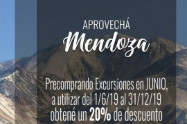 Comprando excursiones en junio, la Asociación Mendocina de Agencias de Viajes y Turismo (Amavyt)ofrece 20% de descuento. La promoción incluye todos los paseos disponibles: Ciudad y Parque, Caminos del Vino, Villavicencio, Cacheuta-Potrerillos, Alta Montaña – Potrerillos, Alta Montaña-Villavicencio, Cañón del Atuel-San Rafael, Cordón del Plata y Valle de Uco. Así, por ejemplo, una excursión corta, que tiene un valor regular de $550, con el descuento ofrecido por Amavyt queda en $440. Y una de día completo, que tiene un valor regular de $1.490, con el descuento queda en $1.192. Los paseos pueden realizarse a partir del momento de la compra, en junio, y hasta el 31 de diciembre de 2019. Conocé las agencias disponibles para los paquetes promocionales y los detalles de cada excursión, en amavyt.org.ar. Sobre Amavyt La Asociación Mendocina de Agencias de Viajes y Turismo tiene entre sus objetivos agrupar a todas las agencias de viajes de carácter comercial Mendoza legalmente constituidas, estudiar los problemas que afectan la actividad turística en general y en especial los de las agencias de viajes, promoviendo y colaborando en la búsqueda de soluciones, y fomentar y estimular el desarrollo turístico, entre otros.