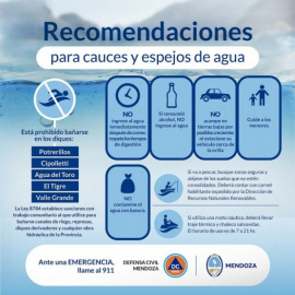 Debido a las altas temperaturas que se están registrando en Mendoza, el Ministerio de Seguridad y Justicia aconseja a la población tomar medidas de prevención para evitar accidentes en espejos de agua y cauces. Asímismo, los especialistas recuerdan que está prohibido bañarse en los espejos de agua y cauces que no se encuentren habilitados para tal fin como: Potrerillos, Cipolletti, Agua del Toro, el Tigre y Valle Grande. “Los canales de riego que administra Irrigación no son aptos para el uso con fines recreativos por la cantidad de agua que suelen contener”, advirtió el director de Defensa Civil, Daniel Burrieza, y explicó que los terrenos acuáticos existentes en la provincia “son cenagosos, rocosos y de grandes profundidades, lo que pone en riesgo la vida al nadar o bañarse”. El funcionario desalentó una práctica que se suele activarse en el ámbito urbano en días de altas temperaturas: “No hay que meterse en las fuentes de las plazas para bañarse o refrescarse dado que existe alto riesgo de recibir una descarga eléctrica”. En lo que respecta a la pesca, quienes la practiquen deberán buscar zonas seguras y alejarse de los suelos que no estén consolidados. Los pescadores necesitan carnet habilitante que se puede solicitar en las oficinas de la Dirección de Recursos Naturales Renovables y locales adheridos. Por último, si se utiliza una moto náutica se debe llevar traje térmico y chaleco salvavidas, desde las 7 hasta las 21 horas y siempre ante cualquier caso de emergencia llamar al 911.