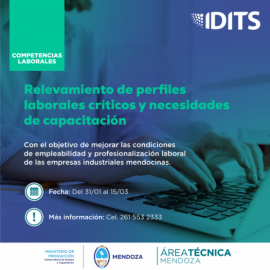 El Instituto Industrial, Tecnológico y de Servicios (IDITS), dando continuidad a su Programa de Certificación de Competencias Laborales, comenzará un relevamiento entre empresas mendocinas, para conocer cuáles son los perfiles laborales más demandados en la actualidad. Este programa busca vincular las necesidades de perfiles laborales y de capacitación con la oferta del sector académico y de oficios. Para hacerlo posible, desde IDITS se reunieron con representantes de universidades del Sistema Académico, Educativo, Científico, Tecnológico y de Investigación, como también de empresas asociadas al instituto para comprender las necesidades de cada entidad y generar un espacio de colaboración y sinergia entre los involucrados, apostando por el trabajo entre el sector público y privado. Asimismo, se mantuvieron reuniones con el personal de la Subsecretaría de Empleo y Capacitación del Ministerio de Producción para potenciar los proyectos existentes en relación a la incorporación de perfiles competentes demandados en las empresas mendocinas. En este sentido, Florencia Padrós, gerente del Área Técnica del IDITS, comentó que el objetivo de este programa es “acompañar a las empresas en la ardua tarea de seleccionar perfiles capacitados y certificados en tareas críticas de producción. Hemos escuchado a nuestros socios y entendemos que se necesita de un esfuerzo conjunto con variedad de actores para poder identificar estos perfiles, capacitarlos e incorporarlos a las empresas”. Y continuó: “Trabajar en conjunto con el sector académico es un primer paso en el marco de este programa”. Con esta iniciativa se busca no solo capacitar nuevos perfiles sino potenciar y reforzar en las capacitaciones necesarias para el personal con el que ya cuenta la empresa. Por ello, se invita a las empresas mendocinas a participar en el relevamiento hasta el 15 de marzo ingresando en el siguiente enlace. Para más información, comunicarse a contacto@idits.org.ar o al 261 155532333.   Sobre el IDITS El Instituto de Desarrollo Industrial, Tecnológico y de Servicios (IDITS) es una asociación civil sin fines de lucro, constituida legalmente en 2002, dedicada a brindar servicios y asistencia técnica a las empresas de Mendoza. Como responsable de la administración de la Zona Franca y el Puerto Seco, además, brinda servicios de comercio exterior y, como agencia de desarrollo, articula e implementa programas que ofrecen herramientas para mejorar la competitividad de los sectores industriales y tecnológico de Mendoza.