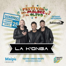 Si bien la banda comenzó originalmente como “La Conga” a principio de la década del 2000, fue recién a fines de 2002 cuando tomó su nombre actual como “La K’onga” y en 2003 presentó su primer disco, “Explosivos”. Con una combinación de cumbia y cuarteto, el grupo fue definiendo su género hasta convertirse en una de las bandas de cuarteto más populares del país, con la incorporación de instrumentos de viento como particularidad. A partir de allí, el grupo compuso los discos “Otra Vez”, “Apasionados” y “Un sentimiento”, el cual incluye su famosa canción La Cabaña, con la cual saltan a la popularidad a nivel nacional en el 2006. La K’onga ha realizado múltiples colaboraciones con artistas de renombre, como Rusherking, Antonio Ríos, Axel, Ke Personajes, Márama, Sergio Dalma, Nicki Nicole, David Bisbal y Alejandro Lerner. Esa misma noche, en el marco del Festival del Malbec y el Olivo, también se presentará la banda Caligaris, como antesala de la presentación de la banda cordobesa. El domingo 25 también se presentarán Los Caligaris, Parió la choca y Mendukos. Cabe destacar que las entradas deben sacarse de manera online por https://www.tuentrada.com