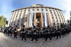 Cientos de mendocinos participaron hoy en el homenaje a los caídos en Malvinas que se realizó en la tarde del lunes frente a la Casa de Gobierno. La vicegobernadora Hebe Casado y ministros del Ejecutivo provincial estuvieron presentes en el acto. Las diferentes fuerzas militares que tienen asiento hoy en Mendoza, veteranos de Malvinas y familiares de soldados caídos en combate marcharon por calle Virgen del Carmen de Cuyo para recordar aquel 2 de abril de 1982 en el que tropas argentinas desembarcaron en las islas. Marcharon la plana mayor de la IV Brigada Aérea junto a dos secciones de 18 efectivos, las autoridades de la VIII Brigada de Montaña con los correspondientes estandartes y dos secciones de efectivos, y también el personal del RIM 16 y sus efectivos andinistas. Participaron además la Compañía de Cazadores de Montaña 8 Teniente Primero Ibáñez, con sus clásicos uniformes blancos, y los miembros de la plana mayor y efectivos de la Base de Apoyo Logístico Mendoza. La Compañía de Comunicaciones de Montaña 8 del Ejército Argentino y la Agrupación XI de Gendarmería Nacional junto a efectivos de la Policía Federal también se hicieron presentes en el desfile, que fue coronado por el vuelo rasante de aviones Pampa de la IV Brigada y de helicópteros Lama.