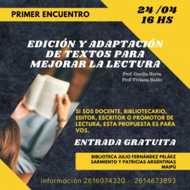 Compartimos esta invitación al  Primer Encuentro Edición y Adaptación de Textos para Mejorar la Lectura, que se llevará a cabo el 24 de abril a las 16 hs, en la Biblioteca Julio fernández Peláez, Maipú. Está destinada a Docentes, Bibliotecaarios, Editores, Escritores, Promotores de la lectura. Con entrada libre y gratuita.
