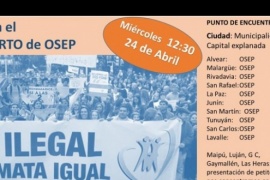 Desde la ONG Marcha por la Vida Mendoza, convocamos para el próximo 24 de Abril a las 12:30 hs. en la explanada de la Municipalidad de Capital y en las dependencias de OSEP de toda la Provincia, haremos una Manifestación a favor de la Vida y contra el protocolo de aborto y también presentaremos un Petitorio de nulidad del Protocolo de Aborto de OSEP, acompañándolo de las más de 3.000 firmas de afiliados a OSEP de toda la provincia contra el aborto en dicha obra social. Los ejes de la convocatoria son: - TODA VIDA VALE, más allá de las circunstancias de su concepción. - Los protocolos de aborto son la puerta de escape de los violadores. - La mujer necesita contención, NO un aborto.