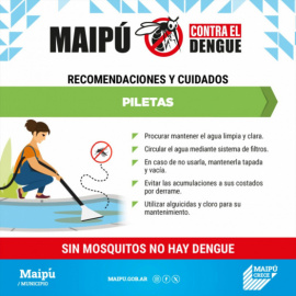 ¿Qué es el dengue? El dengue es una enfermedad viral transmitida por la picadura del mosquito Aedes Aegypti. El mosquito se caracteriza por ser de color negro con franjas blancas en sus patas y abdomen.   ¿Cómo se reproduce? Para reproducirse elige como criadero cualquier recipiente u objeto que acumule o contenga agua para dejar a sus huevos.  Los huevos del mosquito son colocados en la pared interna de los recipientes y pueden resistir condiciones de sequía por más de un año y mantenerse vivos. Al entrar en contacto con el agua, los huevos eclosionan y salen las larvas que crecen y se desarrollan en el agua. Luego de una semana, aproximadamente emergen del agua como mosquitos adultos para continuar con su ciclo de vida.    ¿Cómo se transmite? Cuando el mosquito se alimenta con sangre de una persona enferma de dengue, y luego pica a otras personas, puede transmitir esta enfermedad. La picadura de este mosquito, además de dengue.    ¿Cuáles son las principales recomendación de prevención?    Piletas   Espejos de agua como lagos y lagunas    Patios y espacios verdes    Días de lluvia